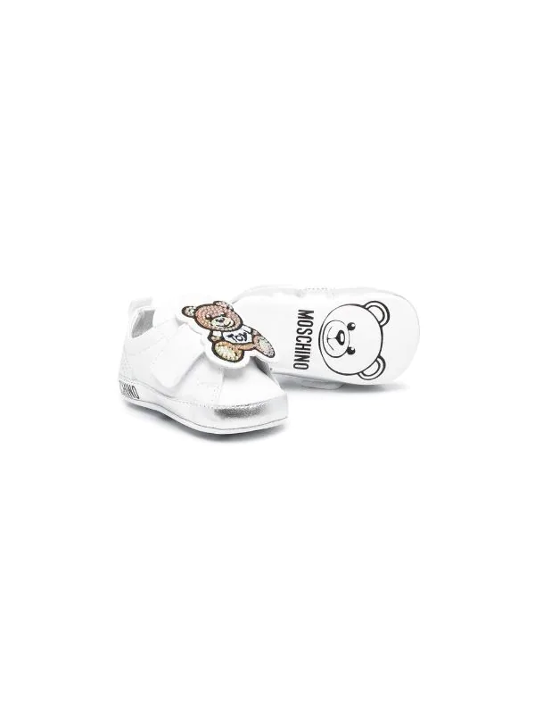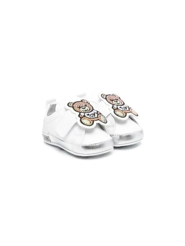 Imprimé ourson, fermeture scratch sur le devant, bout rond, semelle intérieure à logo, semelle plate en caoutchouc. Matière : cuir.