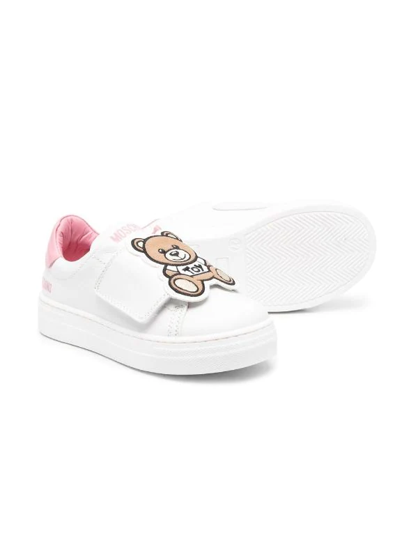 Imprimé ourson, fermeture scratch sur le devant, bout rond, languette à logo imprimé, semelle plate en caoutchouc. Matière : cuir de veau.