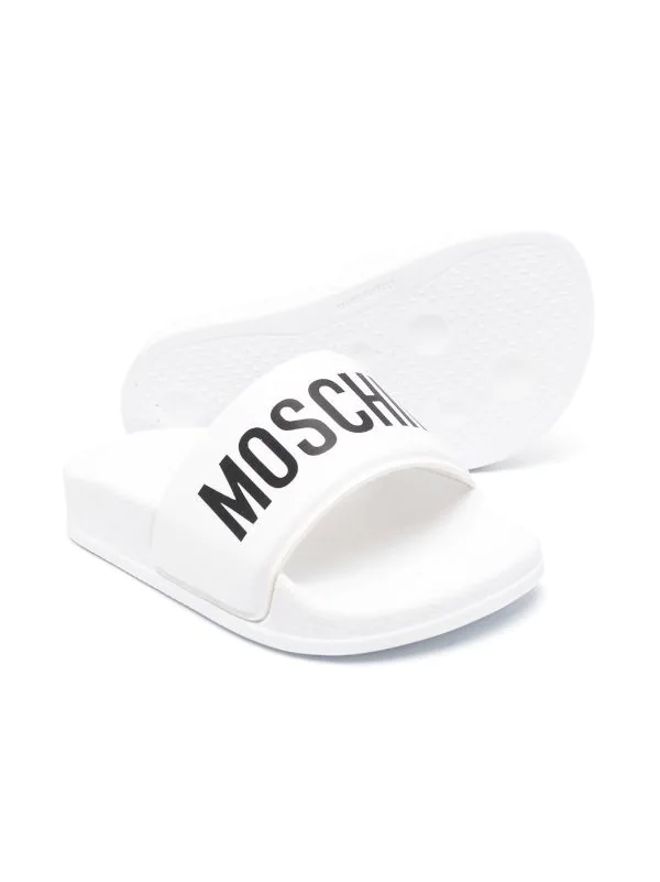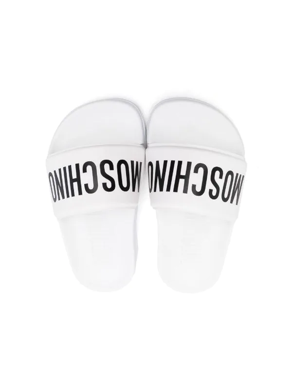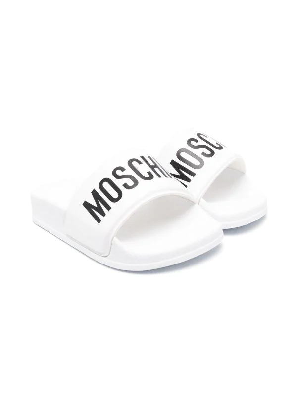 Logo imprimé sur le devant, bout ouvert, semelle plate. Couleur : blanc.
