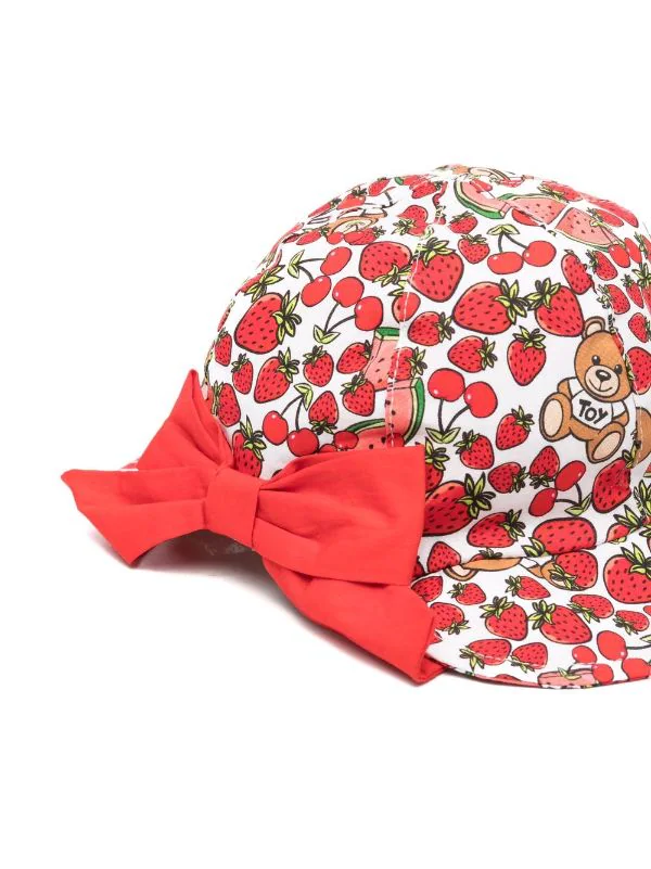 Motif Fraise signature, imprimé ourson, détail de nœud, bord incurvé. Matière : coton.