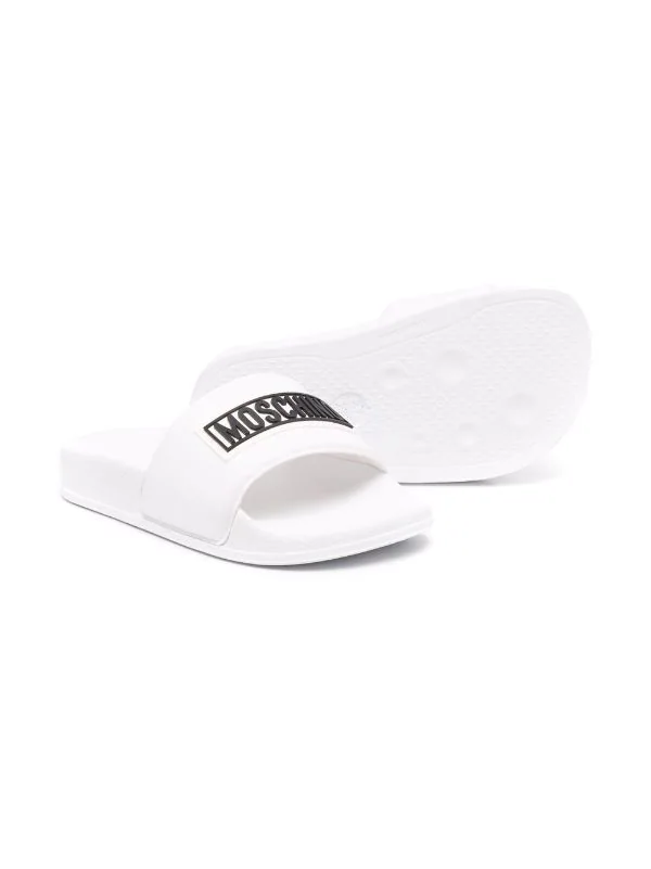 Logo imprimé sur le devant, bout ouvert, semelle plate en caoutchouc, design à enfiler.