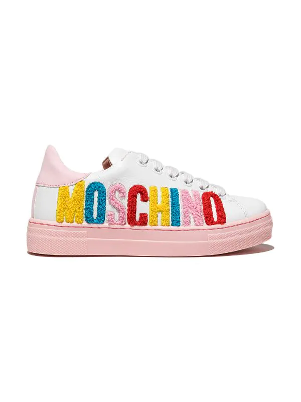 Blanc, cuir, détail de logo embossé, bout rond, fermeture à lacer sur le devant, semelle plate en caoutchouc.