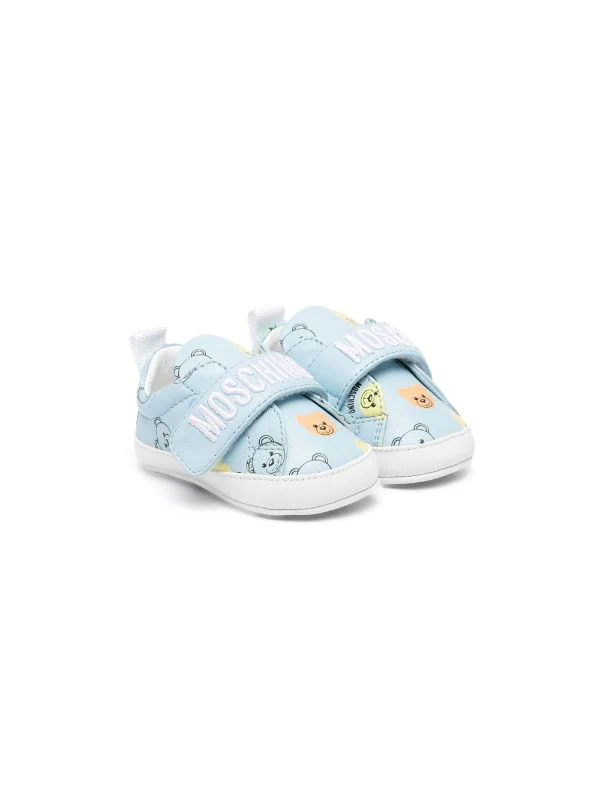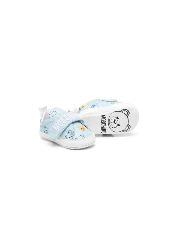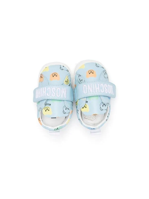 Logo brodé, bout rond, semelle plate, fermeture scratch sur le devant. Couleur : bleu. Matière : cuir.