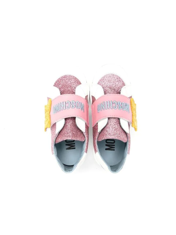 Détail pailleté, logo lettre, patch logo sur le côté, fermeture scratch sur le devant, bout rond, semelle plate en caoutchouc. Matière : cuir.