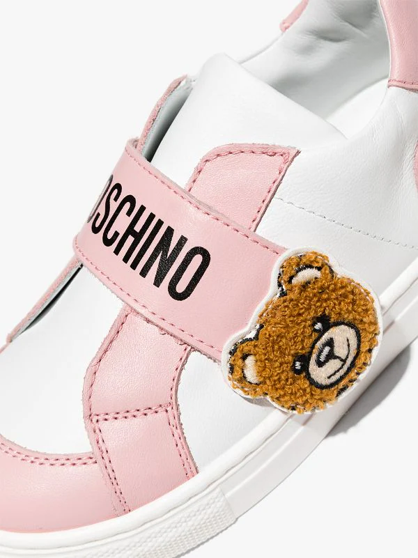Blanc, cuir, modèle bicolore, fermeture scratch sur le devant, logo imprimé sur le devant, motif Teddy Bear signature, semelle plate en caoutchouc.