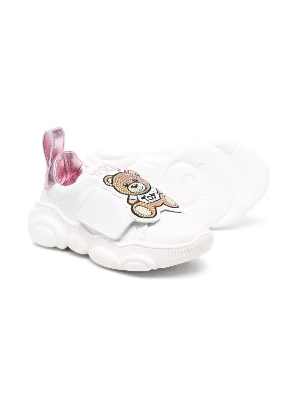 Imprimé ourson, languette d’enfilage au talon, bout rond, fermeture scratch sur le devant, semelle intérieure à logo, semelle plate en caoutchouc. Couleur : blanc. Matière : cuir.