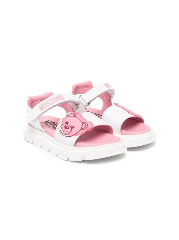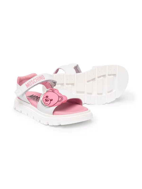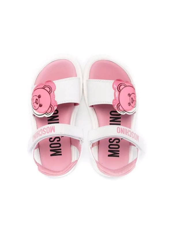Motif Teddy Bear signature, logo imprimé sur le devant, bout ouvert, semelle plate, bride cheville à scratch.