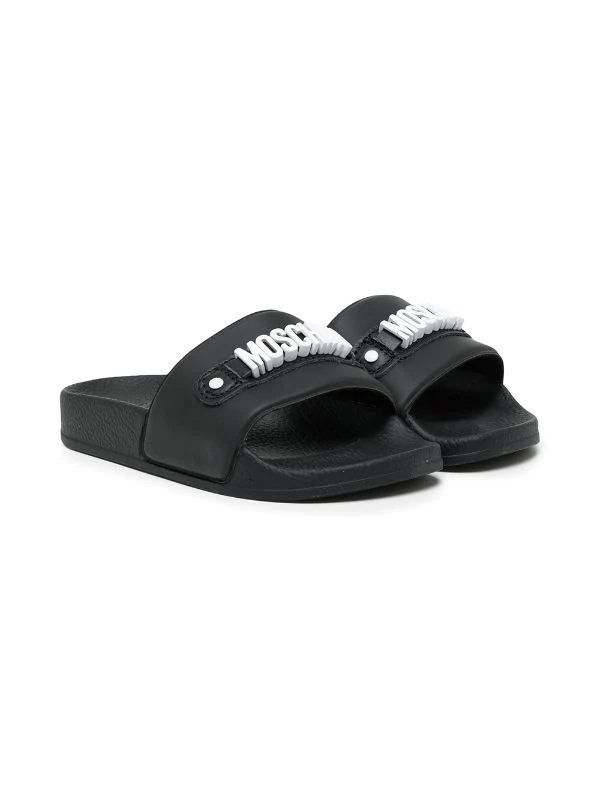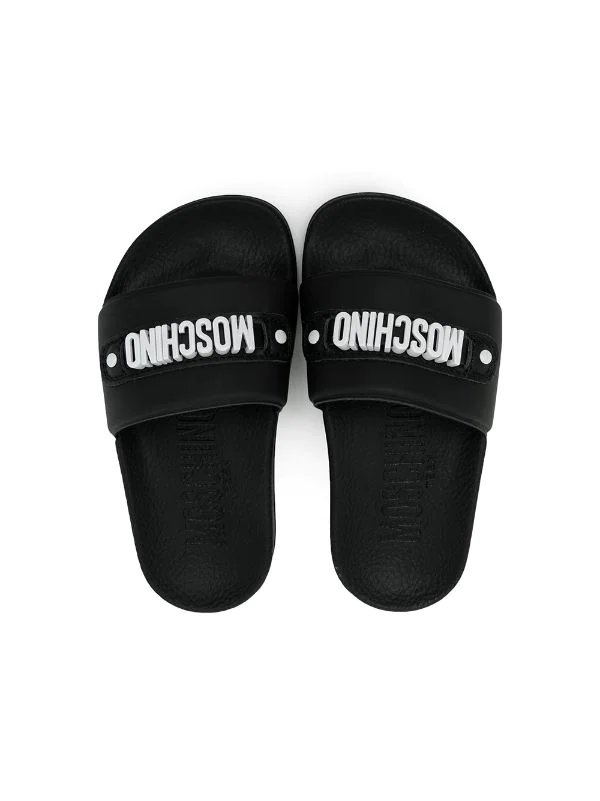 Logo lettre, bout ouvert, semelle intérieure anatomique, semelle intérieure à logo, semelle plate en caoutchouc, design à enfiler. Couleur : noir.