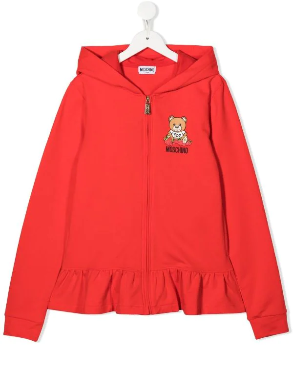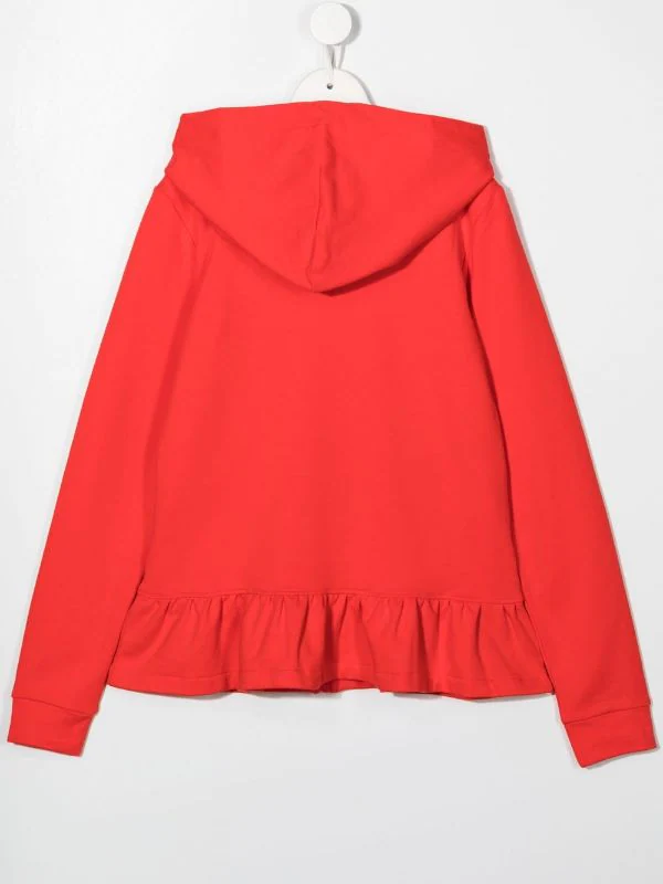 Logo imprimé à la poitrine, ourlet volanté, capuche classique, fermeture zippée devant, manches longues. Couleur : rouge. Matière : coton.