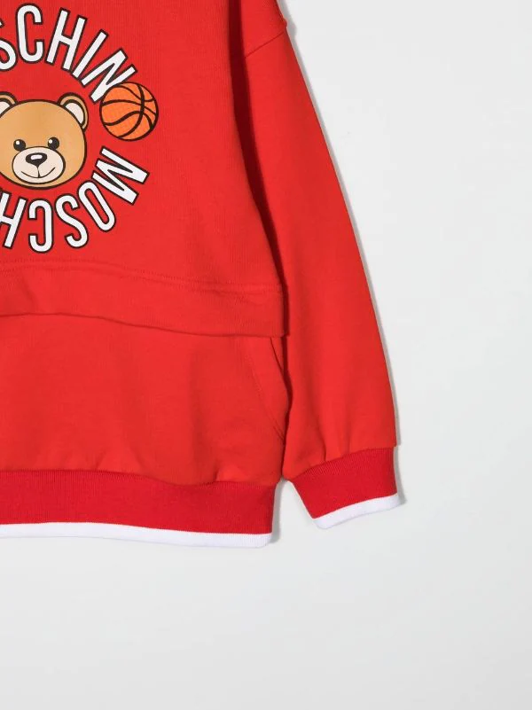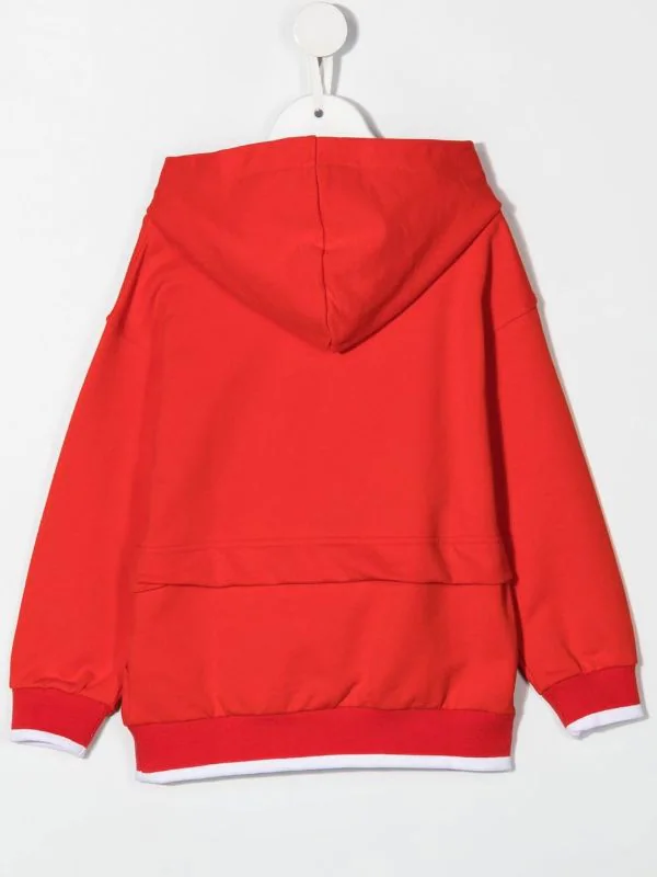 Logo imprimé sur le devant, capuche classique, manches longues, poche plaquée sur le devant, ourlet nervuré. Couleur : rouge. Matière : coton.