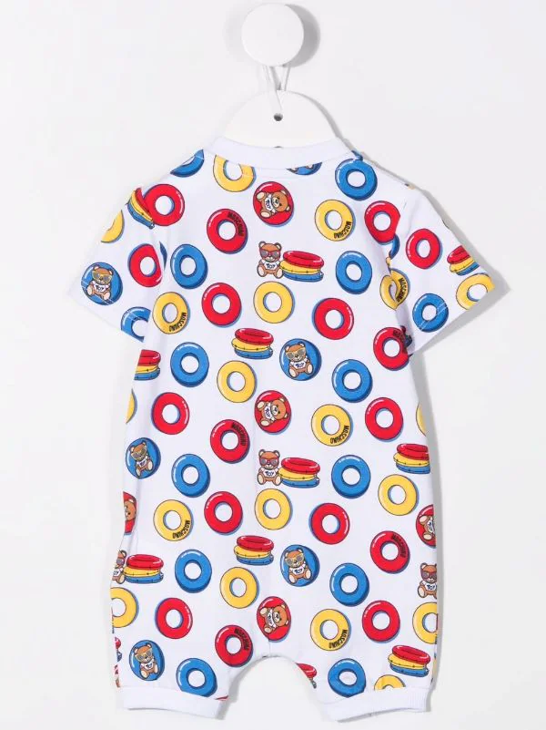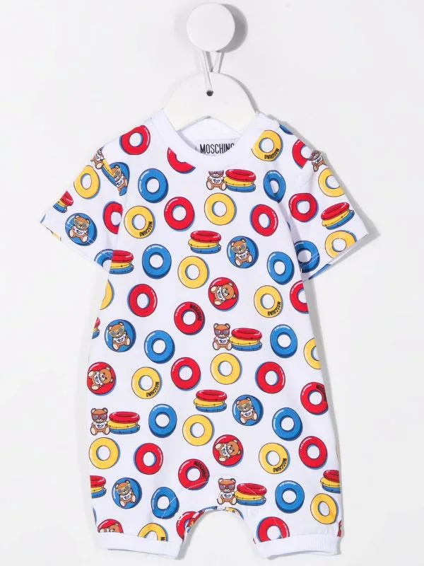 Set de deux, tricot point jersey, motif Teddy Bear signature, imprimé graphique intégral, fermeture à boutons pression, encolure ras du cou, manches courtes, poignets élastiqués.