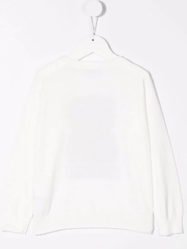 Encolure ronde, manches longues, poignets nervurés, ourlet nervuré, logo intarsia, motif Teddy Bear signature. Matière : coton.