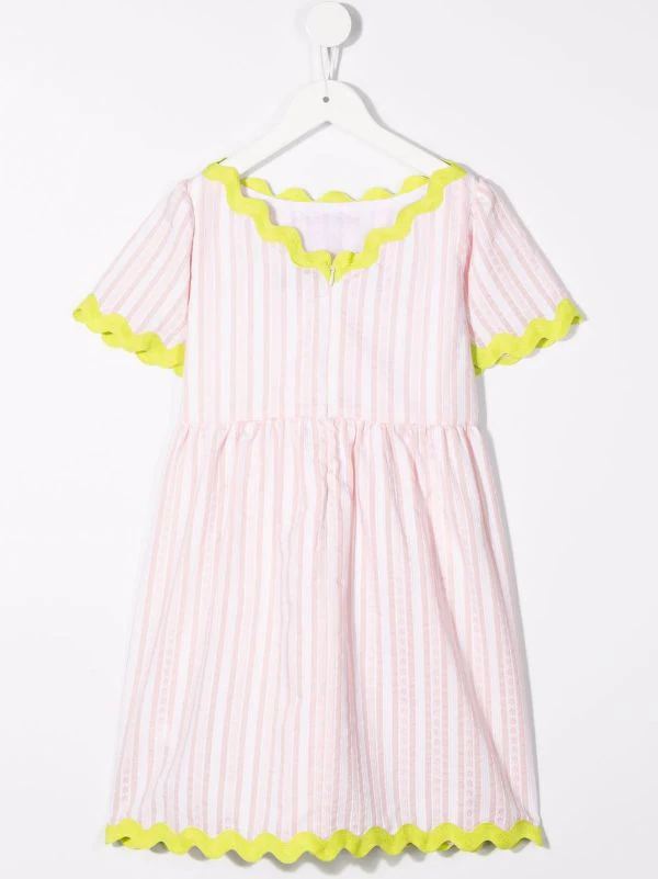 Rayures verticales imprimées, boutons décoratifs, bordure contrastante, bordures festonnées, encolure arrondie, col v au dos, fermeture zippée dissimulée à l’arrière, deux poches plaquées avant, manches courtes, bordures festonnées.
