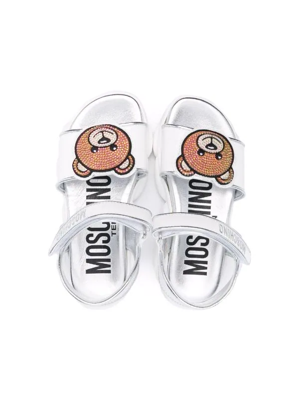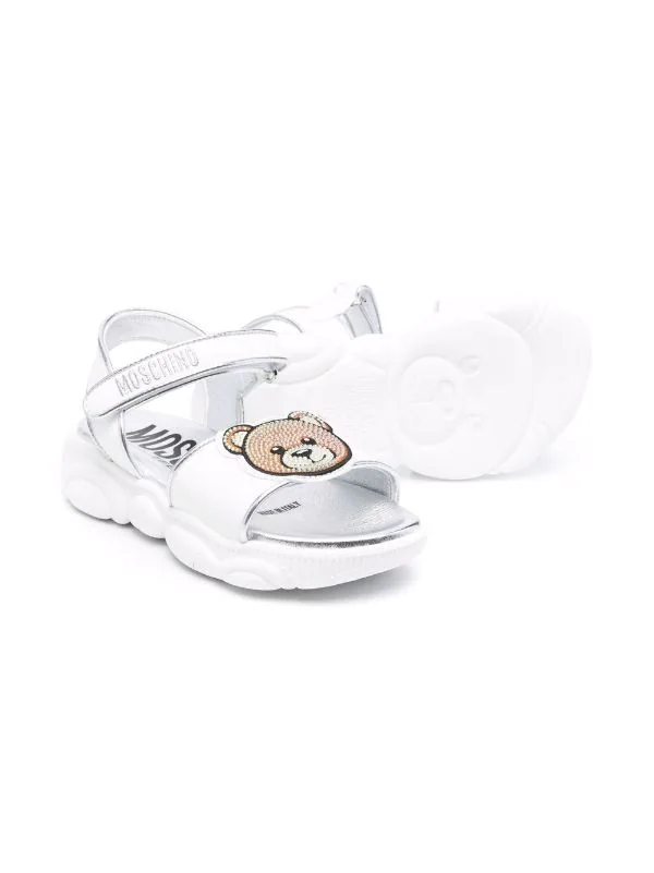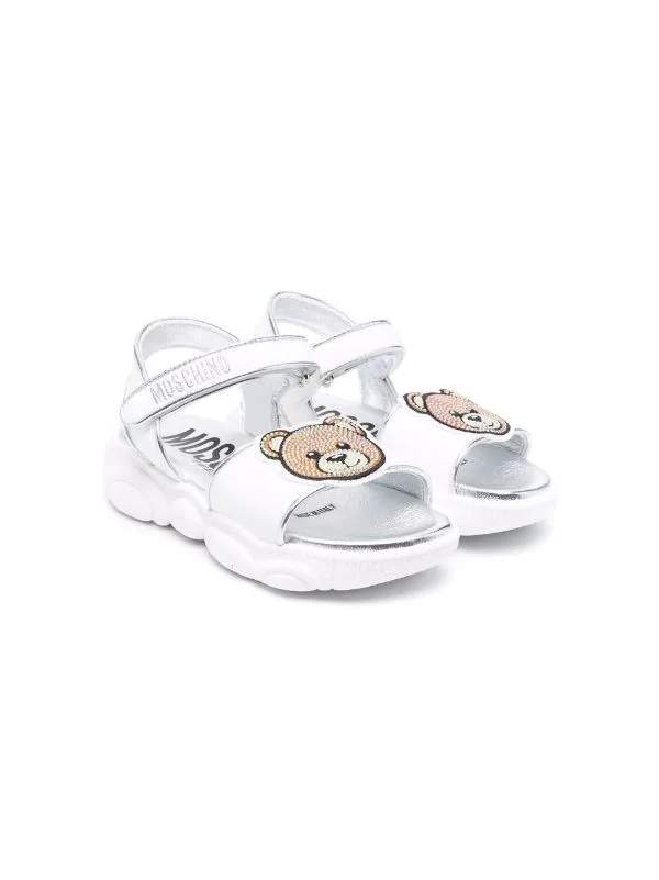 Motif Teddy Bear signature, bout ouvert, semelle plate, bride cheville à scratch. Couleur : blanc.