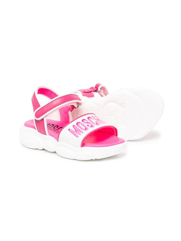 Bride à logo imprimé, bout ouvert, bride cheville à scratch, semelle épaisse en caoutchouc. Matière : cuir.