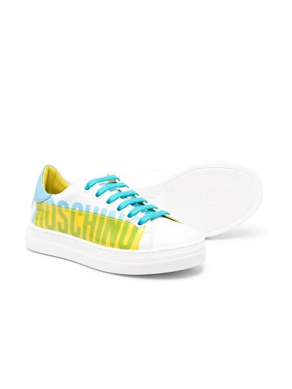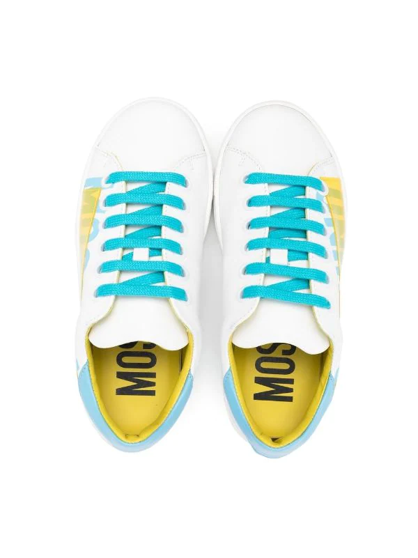 Blanc, jaune, bleu, cuir, bout rond, fermeture à lacer sur le devant, semelle intérieure à logo, semelle en caoutchouc.